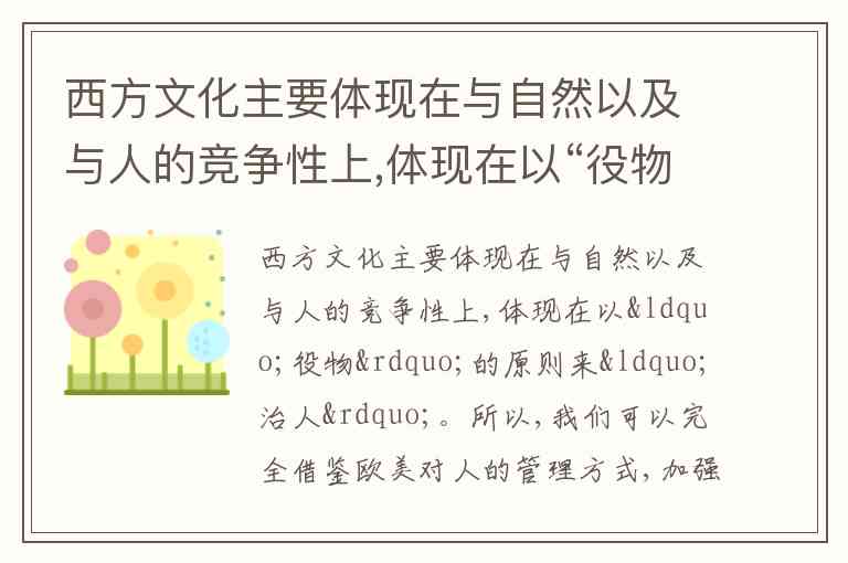西方文化主要体现在与自然以及与人的竞争性上,体现在以“役物”的原则来“治人”。所以,我们可以完全借鉴欧美对人的管理方式,加强管理、提高效率。 A. 正确 B. 错误