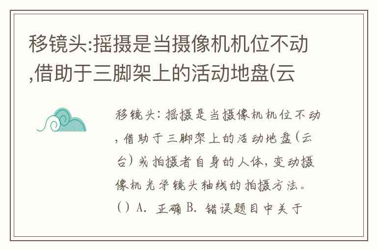移镜头:摇摄是当摄像机机位不动,借助于三脚架上的活动地盘(云台)或拍摄者自身的人体,变动摄像机光学镜头轴线的拍摄方法。( ) A. 正确 B. 错误