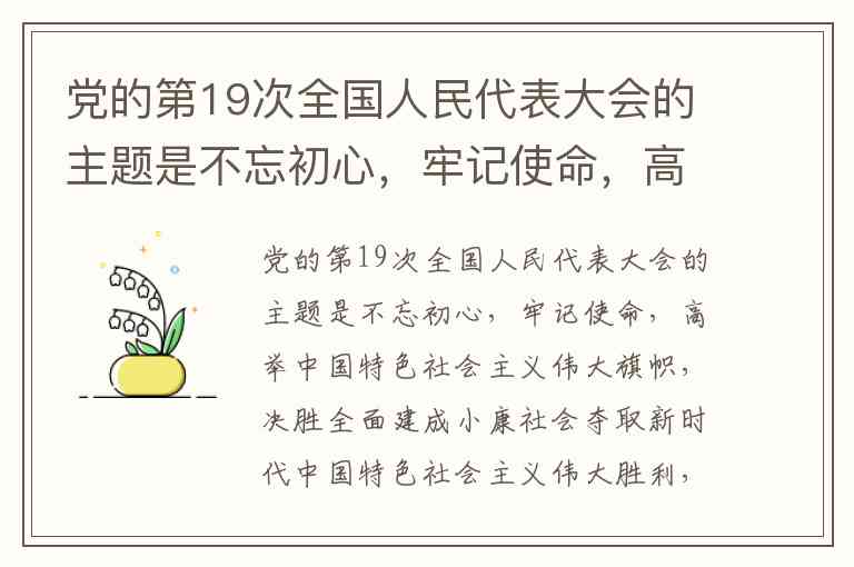 党的第十九次全国代表大会的主题是:“不忘初心,牢记使命,高举中国特色社会主义伟大旗帜,决胜全面建成小康社会,夺取新时代中国特色社会主义伟大胜利,为实现中华民族伟大复兴的中国梦不懈奋斗。” 题目表述中缺少了“小康社会”后的逗号,属于表述不规范,但核心内容准确。