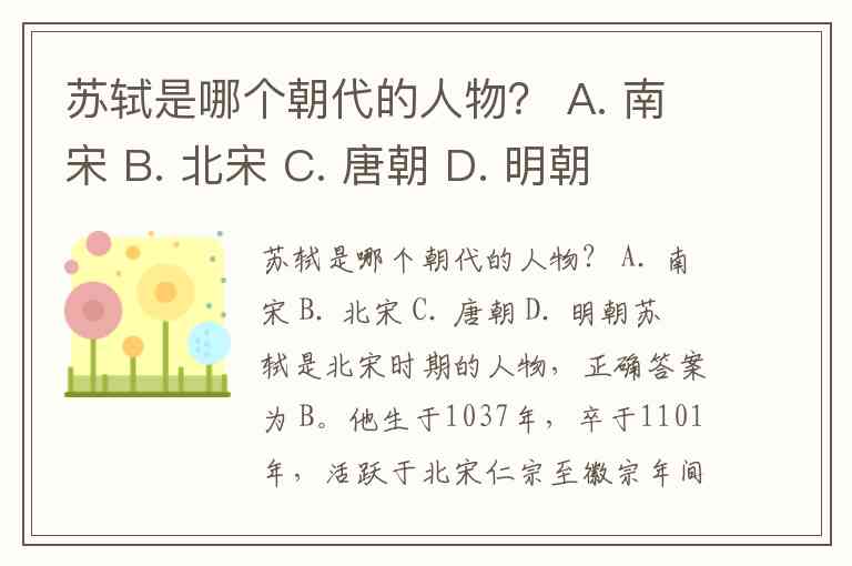 苏轼是哪个朝代的人物? A. 南宋 B. 北宋 C. 唐朝 D. 明朝