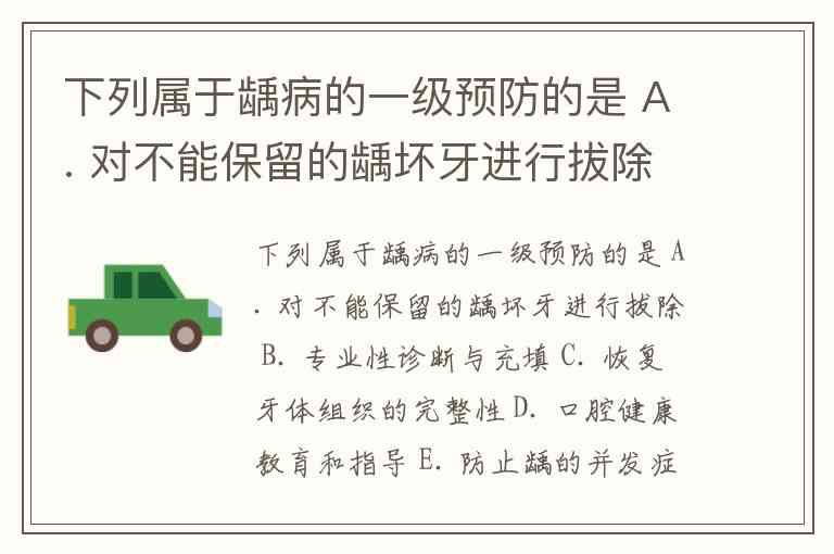 下列属于龋病的一级预防的是 A. 对不能保留的龋坏牙进行拔除 B. 专业性诊断与充填 C. 恢复牙体组织的完整性 D. 口腔健康教育和指导 E. 防止龋的并发症