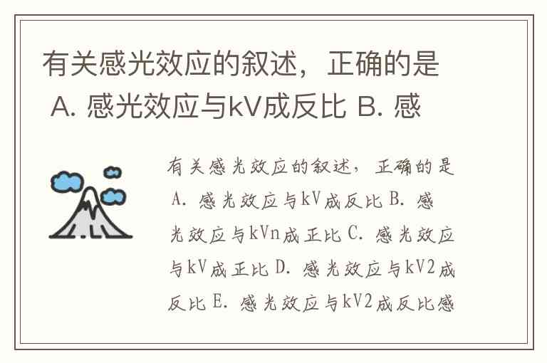 有关感光效应的叙述,正确的是 A. 感光效应与kV成反比 B. 感光效应与kVn成正比 C. 感光效应与kV成正比 D. 感光效应与kV2成反比 E. 感光效应与kV2成反比