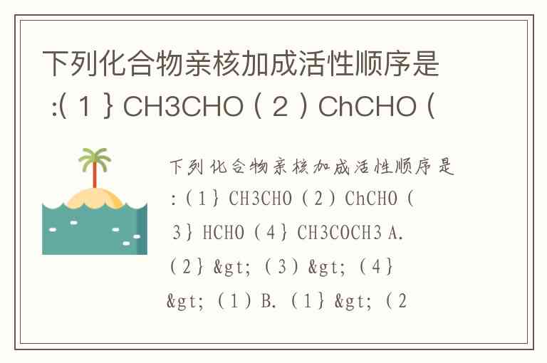 下列化合物亲核加成活性顺序是 :( 1 } CH3CHO ( 2 ) ChCHO ( 3 } HCHO ( 4 } CH3COCH3 A. ( 2 } > ( 3 ) > ( 4 } > ( 1 ) B. ( 1 } > ( 2 } > ( 3 } > ( 4 }