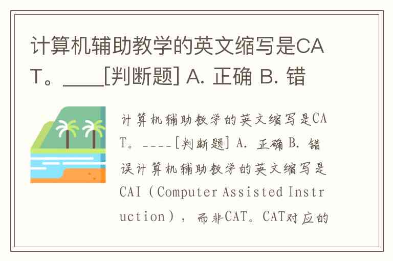 计算机辅助教学的英文缩写是CAT。____[判断题] A. 正确 B. 错误
