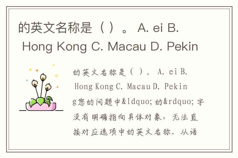 选项中,B项“Hong Kong”是“香港”的英文名称,C项“Macau”对应“澳门”,D项“Peking”是北京的旧称(现通常用“Beijing”),均与单独的“的”字无关。若题目存在表述缺失,建议补充完整具体指向对象。语言学习中,汉字的多义性常需结合语境理解,您是否遇到了特定语境下的翻译困惑?