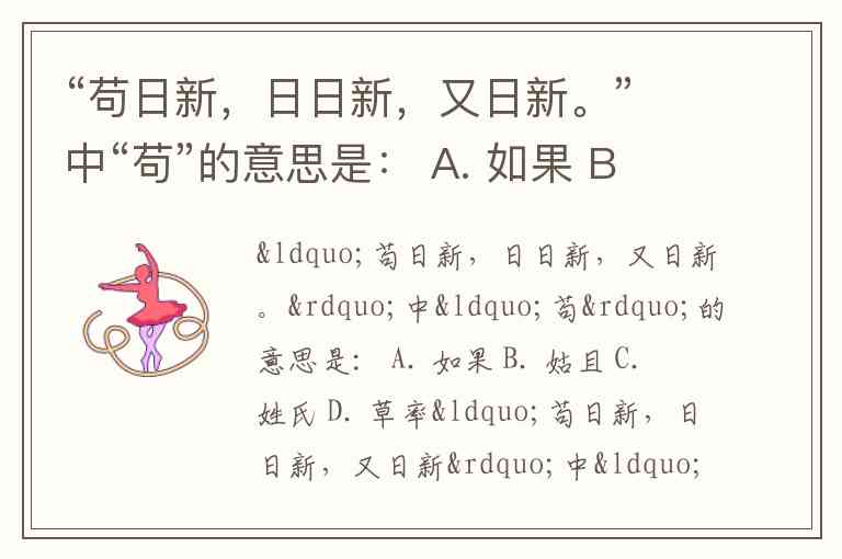 “苟日新,日日新,又日新。”中“苟”的意思是: A. 如果 B. 姑且 C. 姓氏 D. 草率