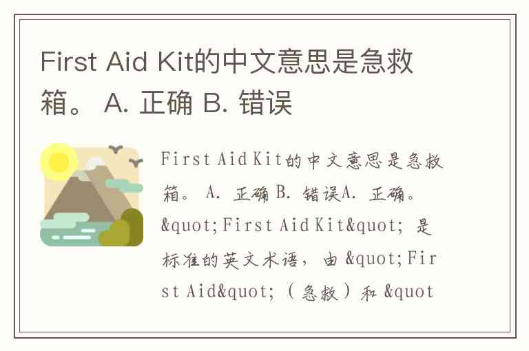 A. 正确。"First Aid Kit" 是标准的英文术语,由 "First Aid"(急救)和 "Kit"(工具包、成套用品)组合而成,中文标准译法就是“急救箱”,指装有急救药品和医疗用品的箱子或包,用于紧急情况下的初步医疗处理。无论是家庭、工作场所还是公共场所配备的急救用品容器,都可称为“急救箱”。这个翻译既准确传达了物品功能,也符合中英文语言习惯的对应关系。