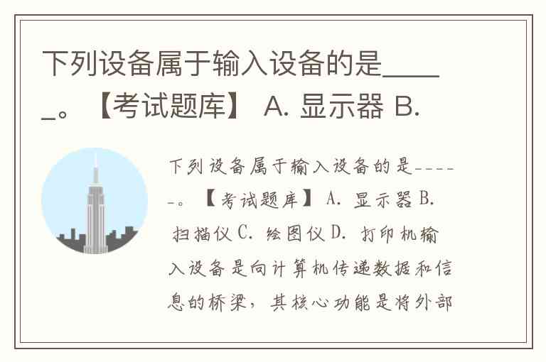 下列设备属于输入设备的是_____。【考试题库】 A. 显示器 B. 扫描仪 C. 绘图仪 D. 打印机