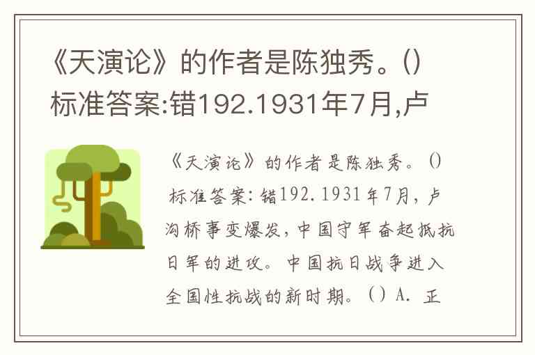 《天演论》的作者是陈独秀。() 标准答案:错192.1931年7月,卢沟桥事变爆发,中国守军奋起抵抗日军的进攻。中国抗日战争进入全国性抗战的新时期。( ) A. 正确 B. 错误