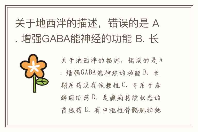 关于地西泮的描述,错误的是 A. 增强GABA能神经的功能 B. 长期用药没有依赖性 C. 可用于麻醉前给药 D. 是癫痫持续状态的首选药 E. 有中枢性骨骼肌松弛作用