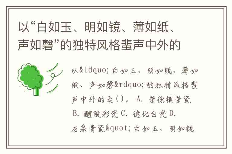 以“白如玉、明如镜、薄如纸、声如磬”的独特风格蜚声中外的是( )。 A. 景德镇景瓷 B. 醴陵彩瓷 C. 德化白瓷 D. 龙泉青瓷