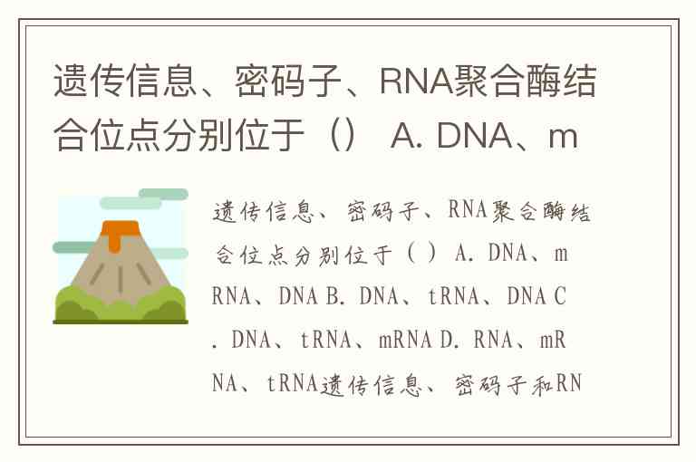 遗传信息、密码子、RNA聚合酶结合位点分别位于() A. DNA、mRNA、DNA B. DNA、tRNA、DNA C. DNA、tRNA、mRNA D. RNA、mRNA、tRNA