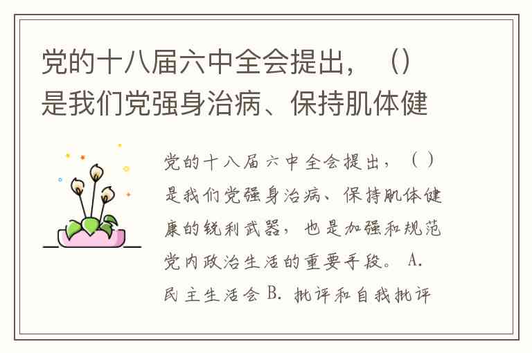 党的十八届六中全会提出,()是我们党强身治病、保持肌体健康的锐利武器,也是加强和规范党内政治生活的重要手段。 A. 民主生活会 B. 批评和自我批评 C. 民主集中制 D. 党的组织生活