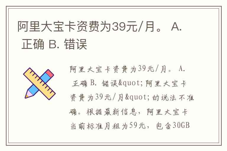 阿里大宝卡资费为39元/月。 A. 正确 B. 错误
