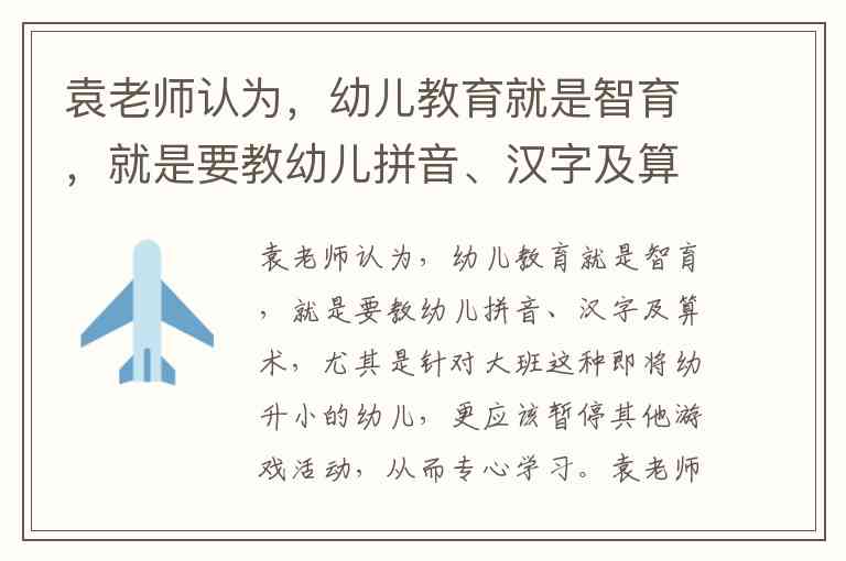 袁老师的做法错误,幼儿教育应是促进幼儿全面发展的教育(选项C)。这种将幼儿教育等同于智育、以拼音汉字算术替代游戏活动的做法,违背了《幼儿园教育指导纲要》中"尊重幼儿身心发展规律,以游戏为基本活动,保教并重"的核心原则。