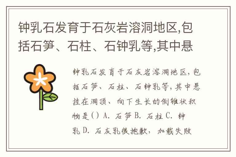 钟乳石发育于石灰岩溶洞地区,包括石笋、石柱、石钟乳等,其中悬挂在洞顶、向下生长的倒锥状积物是( ) A. 石笋 B. 石柱 C. 钟乳 D. 石灰乳
