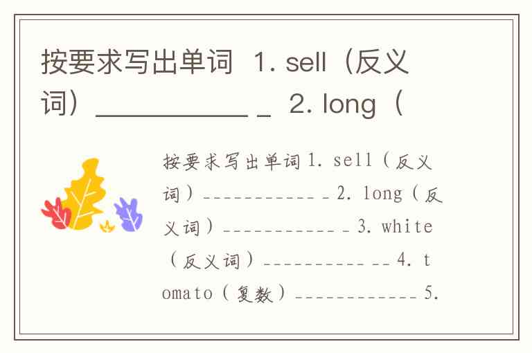 按要求写出单词 1. sell(反义词)___________ _ 2. long(反义词)___________ _ 3. white(反义词)__________ __ 4. tomato(复数)____________ 5. box(复数)_________ ___ 6. like(第三人称单数)____________ 7. bring(反义词)_________ ___