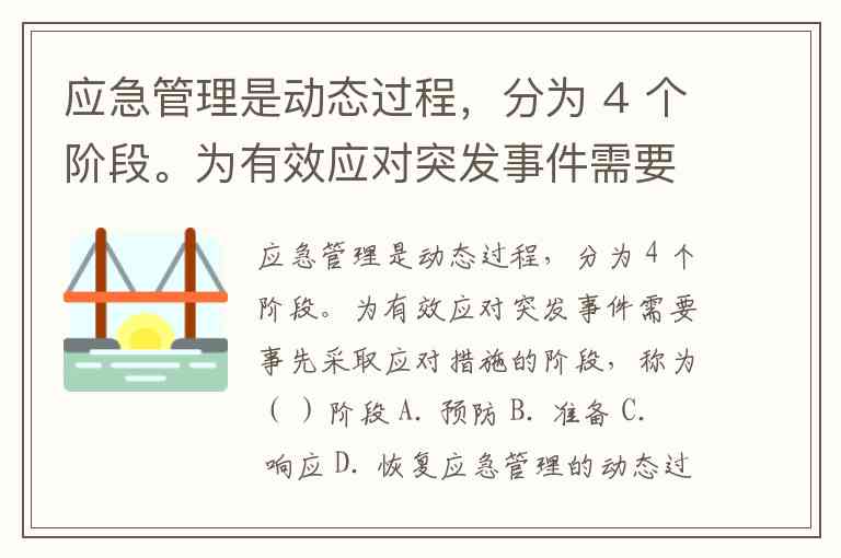 应急管理是动态过程,分为 4 个阶段。为有效应对突发事件需要事先采取应对措施的阶段,称为( )阶段 A. 预防 B. 准备 C. 响应 D. 恢复