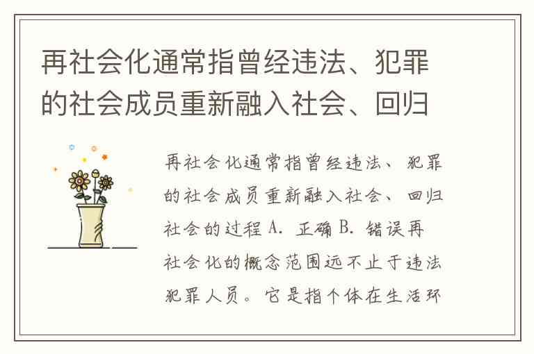 再社会化通常指曾经违法、犯罪的社会成员重新融入社会、回归社会的过程 A. 正确 B. 错误