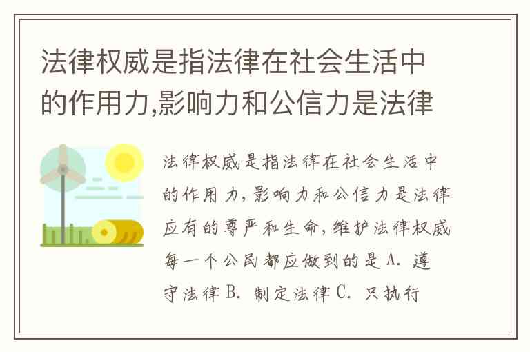 法律权威是指法律在社会生活中的作用力,影响力和公信力是法律应有的尊严和生命,维护法律权威每一个公民都应做到的是 A. 遵守法律 B. 制定法律 C. 只执行法律 D. 适用法律