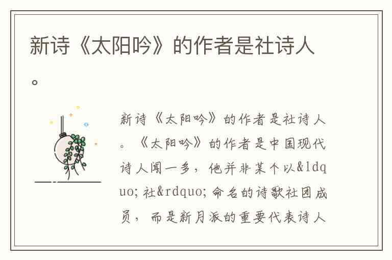 《太阳吟》的作者是中国现代诗人闻一多,他并非某个以“社”命名的诗歌社团成员,而是新月派的重要代表诗人。这首创作于1922年的爱国诗篇收录于诗集《红烛》,是闻一多留学美国期间情感的结晶。