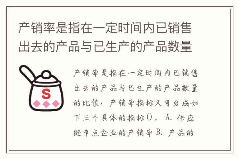 产销率是指在一定时间内已销售出去的产品与已生产的产品数量的比值,产销率指标又可分成如下三个具体的指标()。 A. 供应链节点企业的产销率 B. 产品的产销率 C. 供应链核心企业的产销率 D. 供应链产销率 E. 原材料产销率