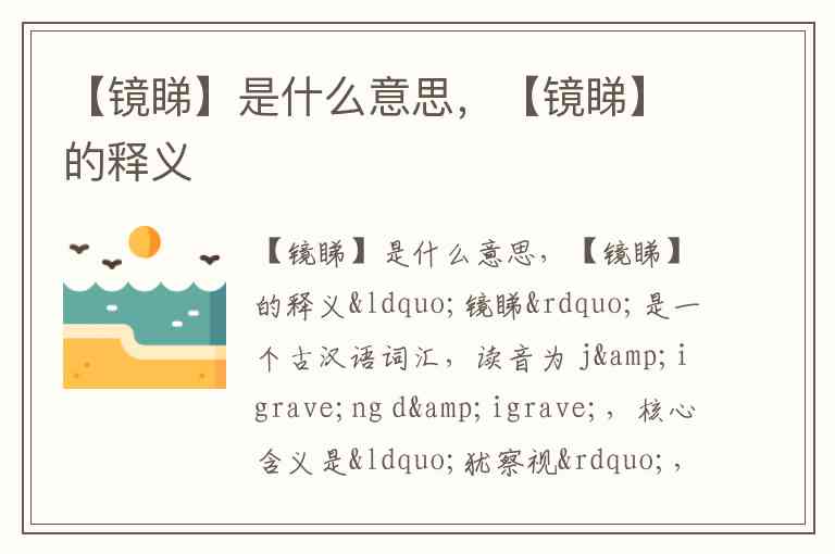 “镜睇”是一个古汉语词汇,读音为 jìnɡ dì,核心含义是“犹察视”,即仔细审视、观察。它由“镜”(镜子,引申为审视)和“睇”(斜看,泛指看)组合而成,体现了如照镜般审慎观察的意味。