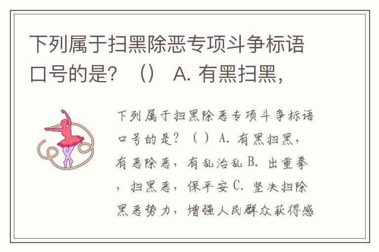 下列属于扫黑除恶专项斗争标语口号的是?() A. 有黑扫黑,有恶除恶,有乱治乱 B. 出重拳,扫黑恶,保平安 C. 坚决扫除黑恶势力,增强人民群众获得感、幸福感、安全感 D. 坚决打赢扫黑除恶专项斗争攻坚战