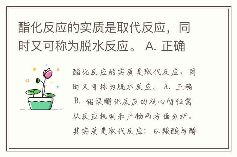 酯化反应的实质是取代反应,同时又可称为脱水反应。 A. 正确 B. 错误