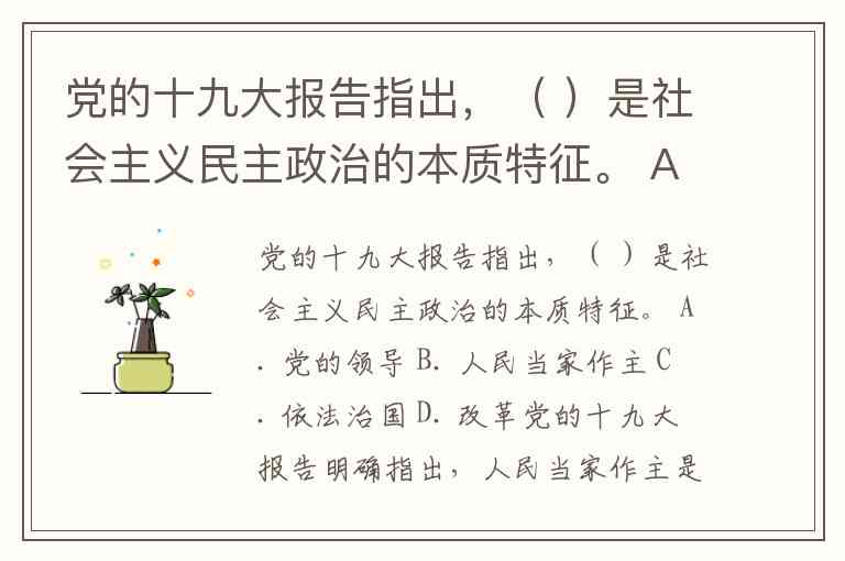 党的十九大报告指出,( )是社会主义民主政治的本质特征。 A. 党的领导 B. 人民当家作主 C. 依法治国 D. 改革