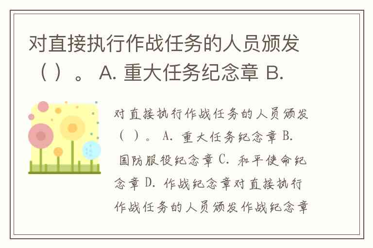 对直接执行作战任务的人员颁发( )。 A. 重大任务纪念章 B. 国防服役纪念章 C. 和平使命纪念章 D. 作战纪念章