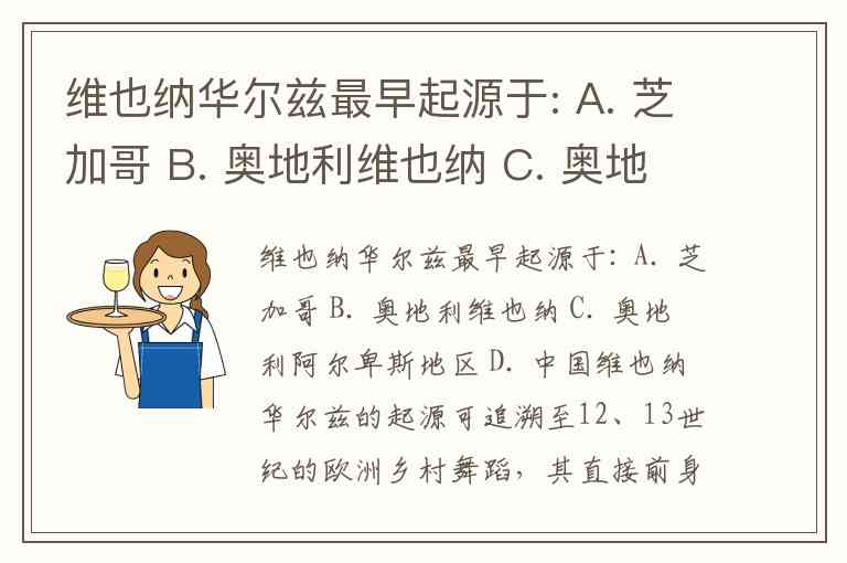 维也纳华尔兹最早起源于: A. 芝加哥 B. 奥地利维也纳 C. 奥地利阿尔卑斯地区 D. 中国