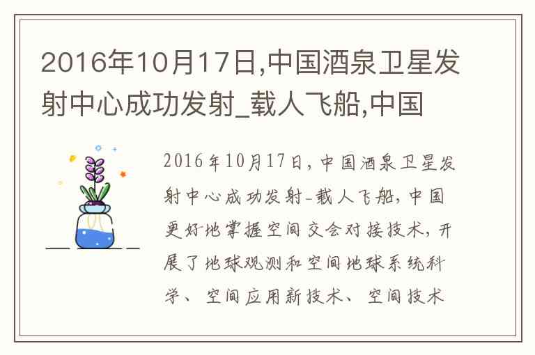 2016年10月17日,中国在酒泉卫星发射中心成功发射的是神舟十一号载人飞船。7时30分,长征二号F遥十一运载火箭点火升空,约575秒后飞船与火箭分离并进入预定轨道,顺利将景海鹏、陈冬两名航天员送入太空。这一任务是中国载人航天工程三步走战略中从第二步向第三步过渡的关键实践,主要目标是与天宫二号空间实验室完成交会对接,并开展为期33天的驻留试验。