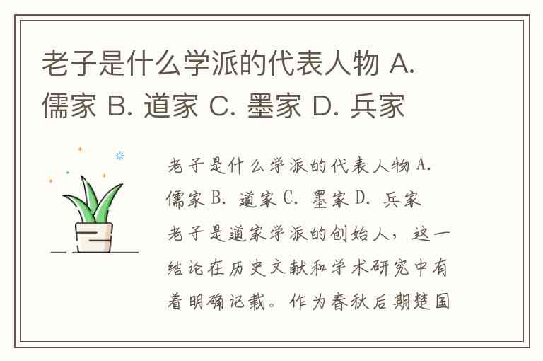 老子是什么学派的代表人物 A. 儒家 B. 道家 C. 墨家 D. 兵家