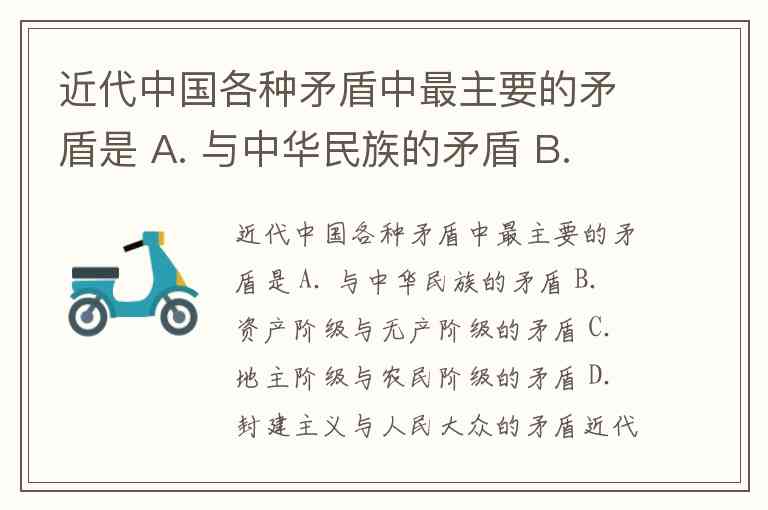 近代中国各种矛盾中最主要的矛盾是 A. 与中华民族的矛盾 B. 资产阶级与无产阶级的矛盾 C. 地主阶级与农民阶级的矛盾 D. 封建主义与人民大众的矛盾