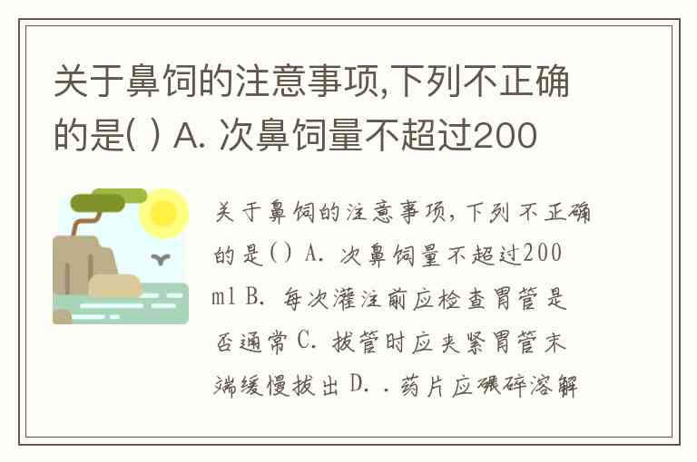 关于鼻饲的注意事项,下列不正确的是( ) A. 次鼻饲量不超过200ml B. 每次灌注前应检查胃管是否通常 C. 拔管时应夹紧胃管末端缓慢拔出 D. .药片应碾碎溶解后注入