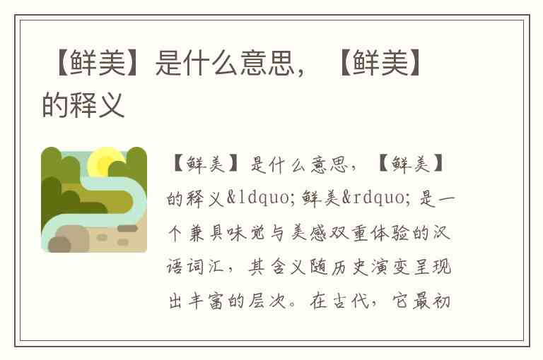 “鲜美”是一个兼具味觉与美感双重体验的汉语词汇,其含义随历史演变呈现出丰富的层次。在古代,它最初用来形容食物的新鲜滋味或自然景物的明艳动人,如《桃花源记》中“芳草鲜美”描绘的便是花草鲜嫩美丽的状态。这种用法延续至现代汉语,却又突破了传统范畴,演变为可形容食物、风景、艺术甚至情感体验的多维度词汇。
