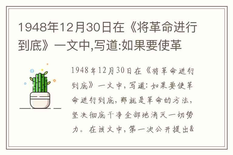 1948年12月30日在《将革命进行到底》一文中,写道:如果要使革命进行到底,那就是革命的方法,坚决彻底干净全部地消灭一切势力。在该文中,第一次公开提出——这一概念。 A. 无产阶级 B. 各革命阶级联合 C. 工人和农民民主 D. 人民民主