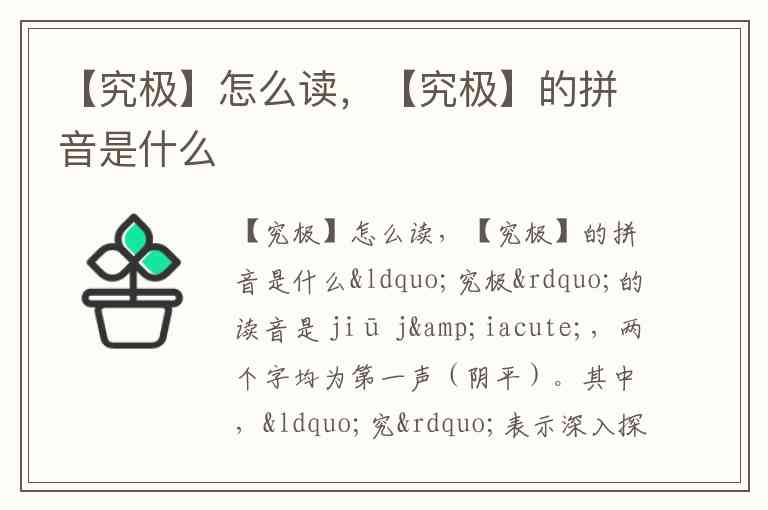 “究极”的读音是 jiū jí,两个字均为第一声(阴平)。其中,“究”表示深入探求、到底,“极”意为顶点、最终,组合起来常指“终极”“最高境界”或“彻底的”,在日语语境中也常被使用,如“究极の策”(最终的策略)。