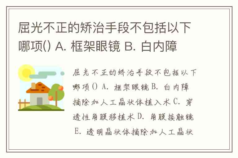 屈光不正的矫治手段不包括以下哪项() A. 框架眼镜 B. 白内障摘除加人工晶状体植入术 C. 穿透性角膜移植术 D. 角膜接触镜 E. 透明晶状体摘除加人工晶状体植入术