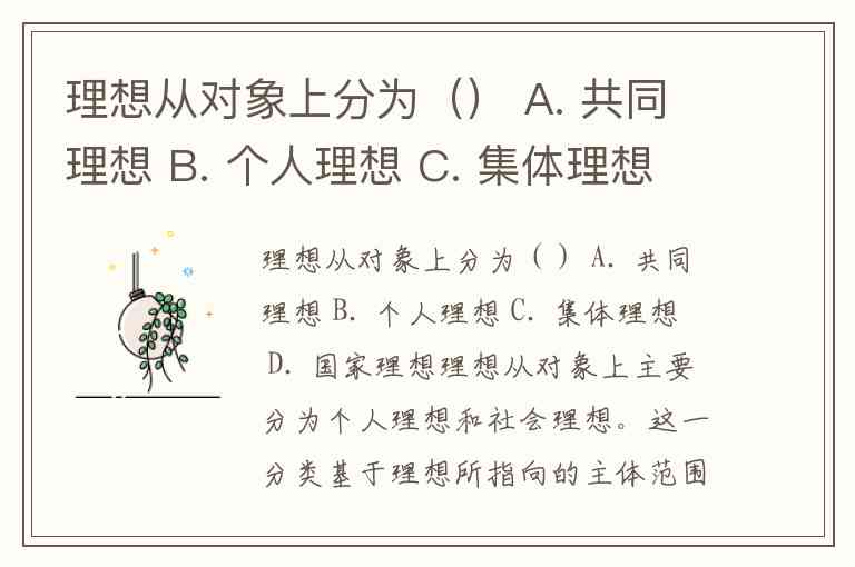 理想从对象上分为() A. 共同理想 B. 个人理想 C. 集体理想 D. 国家理想