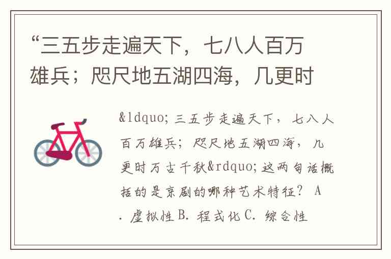 “三五步走遍天下,七八人百万雄兵;咫尺地五湖四海,几更时万古千秋”这两句话概括的是京剧的哪种艺术特征? A. 虚拟性 B. 程式化 C. 综合性