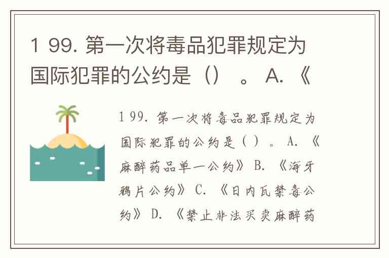 1 99. 第一次将毒品犯罪规定为国际犯罪的公约是() 。 A. 《麻醉药品单一公约》 B. 《海牙鸦片公约》 C. 《日内瓦禁毒公约》 D. 《禁止非法买卖麻醉药品公约》