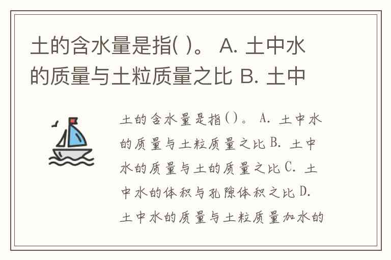 土的含水量是指( )。 A. 土中水的质量与土粒质量之比 B. 土中水的质量与土的质量之比 C. 土中水的体积与孔隙体积之比 D. 土中水的质量与土粒质量加水的质量的和之比