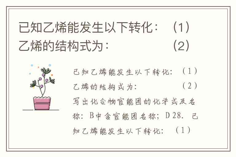 已知乙烯能发生以下转化:(1)乙烯的结构式为: (2)写出化合物官能团的化学式及名称:B中含官能团名称;D 28.已知乙烯能发生以下转化: (1)乙烯的结构式为:____ (2)写出化合物官能团的化学式及名称: B中含官能团名称 ;D中含官能团名称 ; (3)写出反应的化学方程式 ①: ②: ③: