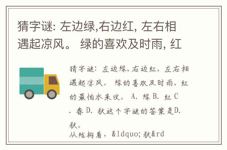 猜字谜: 左边绿,右边红, 左右相遇起凉风。 绿的喜欢及时雨, 红的最怕水来攻。 A. 绿 B. 红 C. 春 D. 秋