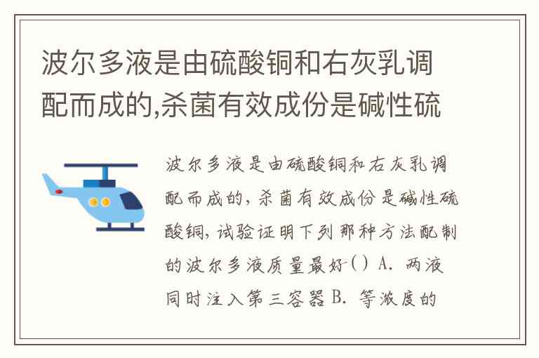 波尔多液是由硫酸铜和右灰乳调配而成的,杀菌有效成份是碱性硫酸铜,试验证明下列那种方法配制的波尔多液质量最好( ) A. 两液同时注入第三容器 B. 等浓度的硫酸铜溶液注入石灰乳中 C. 稀硫酸铜注入浓石灰乳中 D. 热稀硫酸铜注入热浓石灰乳中