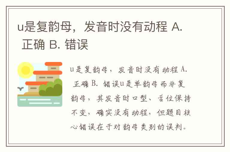 u是复韵母,发音时没有动程 A. 正确 B. 错误