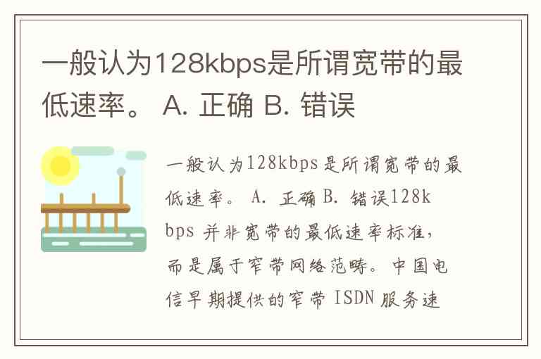 一般认为128kbps是所谓宽带的最低速率。 A. 正确 B. 错误