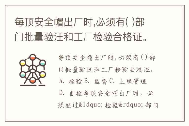 每顶安全帽出厂时,必须经过“检验”部门的批量验证并附带工厂检验合格证。这一要求出自安全生产管理领域的规范性要求,旨在通过专业检验环节确保安全帽的安全防护性能符合标准。在安全生产管理知识相关试题中,该知识点通常作为基础考核内容,强调产品出厂前第三方检验的必要性,以区别于企业自检或其他管理环节的验证流程。